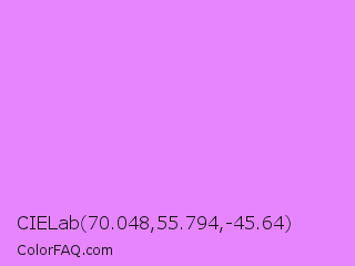 CIELab 70.048,55.794,-45.64 Color is a light purple color and the nearest color is Lavender Magenta #ee82ee. Hex code #e685ff and RGB value is rgb(230,133,255). In RGB color space, this color is composed of 90% red, 52% green, 100% blue, In CMYK color space, this color is composed of 10% cyan, 48% magenta, 0% yellow , 0% black , In HSL color space, this color has a hue angle of 288° , 100% saturation and 76% lightness.