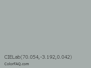 CIELab 70.054,-3.192,0.042 Color is a light cyan color and the nearest color is Edward #a2aeab. Hex code #a5adab and RGB value is rgb(165,173,171). In RGB color space, this color is composed of 65% red, 68% green, 67% blue, In CMYK color space, this color is composed of 5% cyan, 0% magenta, 1% yellow , 32% black , In HSL color space, this color has a hue angle of 165° , 5% saturation and 66% lightness.
