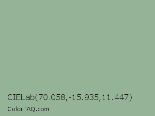 CIELab 70.058,-15.935,11.447 Color is a light green color and the nearest color is Dark Sea Green #8fbc8f. Hex code #95b396 and RGB value is rgb(149,179,150). In RGB color space, this color is composed of 58% red, 70% green, 59% blue, In CMYK color space, this color is composed of 17% cyan, 0% magenta, 16% yellow , 30% black , In HSL color space, this color has a hue angle of 122° , 16% saturation and 64% lightness.