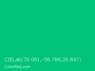 CIELab 70.061,-58.788,26.847 Color is a normal green color and the nearest color is Green Munsell #00a877. Hex code #00c478 and RGB value is rgb(0,196,120). In RGB color space, this color is composed of 0% red, 77% green, 47% blue, In CMYK color space, this color is composed of 100% cyan, 0% magenta, 39% yellow , 23% black , In HSL color space, this color has a hue angle of 157° , 100% saturation and 38% lightness.