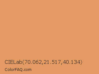 CIELab 70.062,21.517,40.134 Color is a light orange color and the nearest color is Di Serria #db995e. Hex code #e49b63 and RGB value is rgb(228,155,99). In RGB color space, this color is composed of 89% red, 61% green, 39% blue, In CMYK color space, this color is composed of 0% cyan, 32% magenta, 57% yellow , 11% black , In HSL color space, this color has a hue angle of 26° , 70% saturation and 64% lightness.