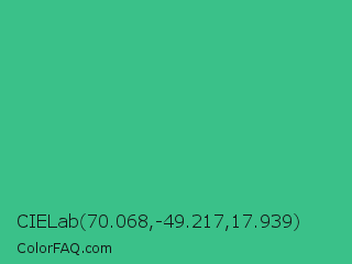 CIELab 70.068,-49.217,17.939 Color is a normal green color and the nearest color is Mountain Meadow #30ba8f. Hex code #3ac189 and RGB value is rgb(58,193,137). In RGB color space, this color is composed of 23% red, 76% green, 54% blue, In CMYK color space, this color is composed of 70% cyan, 0% magenta, 29% yellow , 24% black , In HSL color space, this color has a hue angle of 155° , 54% saturation and 49% lightness.