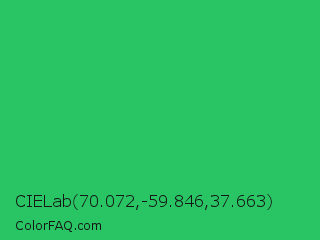 CIELab 70.072,-59.846,37.663 Color is a normal green color and the nearest color is UFO Green #3cd070. Hex code #29c463 and RGB value is rgb(41,196,99). In RGB color space, this color is composed of 16% red, 77% green, 39% blue, In CMYK color space, this color is composed of 79% cyan, 0% magenta, 49% yellow , 23% black , In HSL color space, this color has a hue angle of 142° , 65% saturation and 46% lightness.