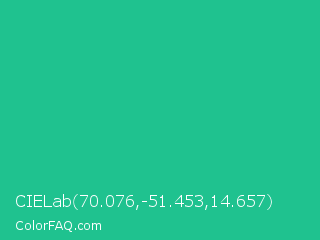 CIELab 70.076,-51.453,14.657 Color is a normal green color and the nearest color is Mountain Meadow Crayola #1ab385. Hex code #1fc28f and RGB value is rgb(31,194,143). In RGB color space, this color is composed of 12% red, 76% green, 56% blue, In CMYK color space, this color is composed of 84% cyan, 0% magenta, 26% yellow , 24% black , In HSL color space, this color has a hue angle of 161° , 72% saturation and 44% lightness.