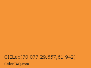 CIELab 70.077,29.657,61.942 Color is a normal orange color and the nearest color is Neon Carrot Crayola #ff9933. Hex code #f59436 and RGB value is rgb(245,148,54). In RGB color space, this color is composed of 96% red, 58% green, 21% blue, In CMYK color space, this color is composed of 0% cyan, 40% magenta, 78% yellow , 4% black , In HSL color space, this color has a hue angle of 30° , 91% saturation and 59% lightness.