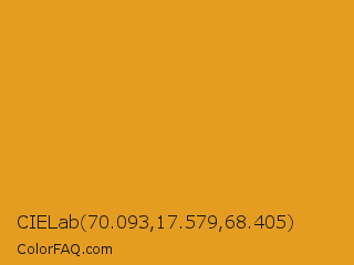CIELab 70.093,17.579,68.405 Color is a normal orange color and the nearest color is Marigold #eaa221. Hex code #e59d21 and RGB value is rgb(229,157,33). In RGB color space, this color is composed of 90% red, 62% green, 13% blue, In CMYK color space, this color is composed of 0% cyan, 31% magenta, 86% yellow , 10% black , In HSL color space, this color has a hue angle of 38° , 79% saturation and 51% lightness.