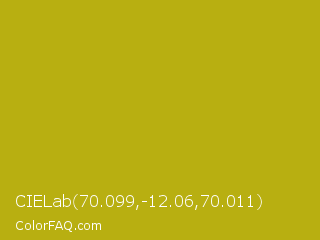 CIELab 70.099,-12.06,70.011 Color is a normal yellow color and the nearest color is Sahara #b7a214. Hex code #b8af11 and RGB value is rgb(184,175,17). In RGB color space, this color is composed of 72% red, 69% green, 7% blue, In CMYK color space, this color is composed of 0% cyan, 5% magenta, 91% yellow , 28% black , In HSL color space, this color has a hue angle of 57° , 83% saturation and 39% lightness.