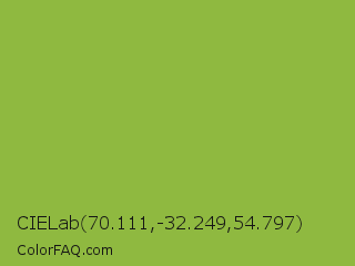 CIELab 70.111,-32.249,54.797 Color is a normal green color and the nearest color is Sushi #87ab39. Hex code #8fb940 and RGB value is rgb(143,185,64). In RGB color space, this color is composed of 56% red, 73% green, 25% blue, In CMYK color space, this color is composed of 23% cyan, 0% magenta, 65% yellow , 27% black , In HSL color space, this color has a hue angle of 81° , 49% saturation and 49% lightness.