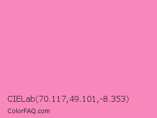 CIELab 70.117,49.101,-8.353 Color is a light rose color and the nearest color is Persian Pink #f77fbe. Hex code #f887bc and RGB value is rgb(248,135,188). In RGB color space, this color is composed of 97% red, 53% green, 74% blue, In CMYK color space, this color is composed of 0% cyan, 46% magenta, 24% yellow , 3% black , In HSL color space, this color has a hue angle of 332° , 89% saturation and 75% lightness.