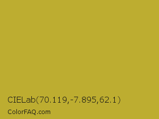 CIELab 70.119,-7.895,62.1 Color is a normal yellow color and the nearest color is Hokey Pokey #c8a528. Hex code #bdad30 and RGB value is rgb(189,173,48). In RGB color space, this color is composed of 74% red, 68% green, 19% blue, In CMYK color space, this color is composed of 0% cyan, 8% magenta, 75% yellow , 26% black , In HSL color space, this color has a hue angle of 53° , 59% saturation and 46% lightness.