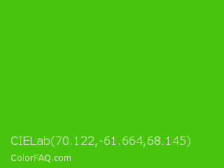 CIELab 70.122,-61.664,68.145 Color is a normal green color and the nearest color is Harlequin Green #46cb18. Hex code #49c40c and RGB value is rgb(73,196,12). In RGB color space, this color is composed of 29% red, 77% green, 5% blue, In CMYK color space, this color is composed of 63% cyan, 0% magenta, 94% yellow , 23% black , In HSL color space, this color has a hue angle of 100° , 88% saturation and 41% lightness.