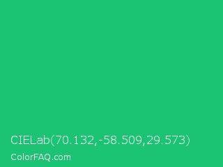 CIELab 70.132,-58.509,29.573 Color is a normal green color and the nearest color is Green Crayola #1cac78. Hex code #1ac473 and RGB value is rgb(26,196,115). In RGB color space, this color is composed of 10% red, 77% green, 45% blue, In CMYK color space, this color is composed of 87% cyan, 0% magenta, 41% yellow , 23% black , In HSL color space, this color has a hue angle of 151° , 77% saturation and 44% lightness.