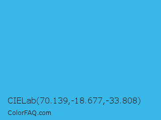CIELab 70.139,-18.677,-33.808 Color is a normal blue color and the nearest color is Picton Blue #45b1e8. Hex code #38b8e8 and RGB value is rgb(56,184,232). In RGB color space, this color is composed of 22% red, 72% green, 91% blue, In CMYK color space, this color is composed of 76% cyan, 21% magenta, 0% yellow , 9% black , In HSL color space, this color has a hue angle of 196° , 79% saturation and 56% lightness.