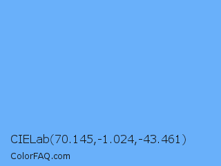 CIELab 70.145,-1.024,-43.461 Color is a light blue color and the nearest color is French Sky Blue #77b5fe. Hex code #69b0fa and RGB value is rgb(105,176,250). In RGB color space, this color is composed of 41% red, 69% green, 98% blue, In CMYK color space, this color is composed of 58% cyan, 30% magenta, 0% yellow , 2% black , In HSL color space, this color has a hue angle of 211° , 94% saturation and 70% lightness.