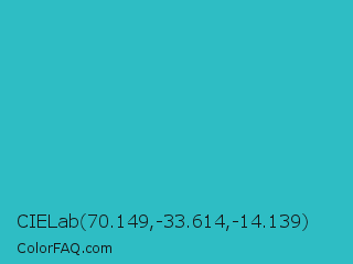 CIELab 70.149,-33.614,-14.139 Color is a normal cyan color and the nearest color is Maximum Blue Green #30bfbf. Hex code #2ebdc4 and RGB value is rgb(46,189,196). In RGB color space, this color is composed of 18% red, 74% green, 77% blue, In CMYK color space, this color is composed of 77% cyan, 4% magenta, 0% yellow , 23% black , In HSL color space, this color has a hue angle of 183° , 62% saturation and 47% lightness.