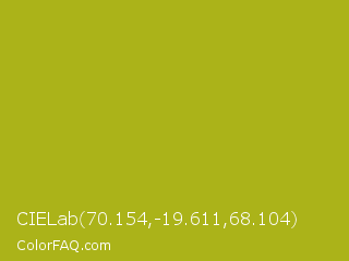 CIELab 70.154,-19.611,68.104 Color is a normal yellow color and the nearest color is Acid Green #b0bf1a. Hex code #abb319 and RGB value is rgb(171,179,25). In RGB color space, this color is composed of 67% red, 70% green, 10% blue, In CMYK color space, this color is composed of 4% cyan, 0% magenta, 86% yellow , 30% black , In HSL color space, this color has a hue angle of 63° , 75% saturation and 40% lightness.