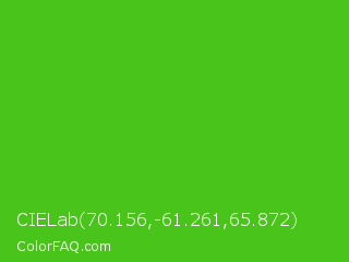 CIELab 70.156,-61.261,65.872 Color is a normal green color and the nearest color is Harlequin Green #46cb18. Hex code #49c41a and RGB value is rgb(73,196,26). In RGB color space, this color is composed of 29% red, 77% green, 10% blue, In CMYK color space, this color is composed of 63% cyan, 0% magenta, 87% yellow , 23% black , In HSL color space, this color has a hue angle of 103° , 77% saturation and 44% lightness.