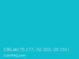 CIELab 70.177,-32.323,-20.151 Color is a normal cyan color and the nearest color is Turquoise Surf #00c5cd. Hex code #0fbdcf and RGB value is rgb(15,189,207). In RGB color space, this color is composed of 6% red, 74% green, 81% blue, In CMYK color space, this color is composed of 93% cyan, 9% magenta, 0% yellow , 19% black , In HSL color space, this color has a hue angle of 186° , 86% saturation and 44% lightness.
