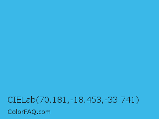 CIELab 70.181,-18.453,-33.741 Color is a normal blue color and the nearest color is Picton Blue #45b1e8. Hex code #3ab8e8 and RGB value is rgb(58,184,232). In RGB color space, this color is composed of 23% red, 72% green, 91% blue, In CMYK color space, this color is composed of 75% cyan, 21% magenta, 0% yellow , 9% black , In HSL color space, this color has a hue angle of 197° , 79% saturation and 57% lightness.