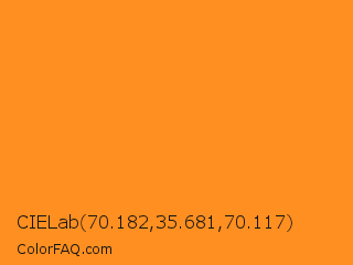 CIELab 70.182,35.681,70.117 Color is a normal orange color and the nearest color is Tree Poppy #fc9c1d. Hex code #ff8f20 and RGB value is rgb(255,143,32). In RGB color space, this color is composed of 100% red, 56% green, 13% blue, In CMYK color space, this color is composed of 0% cyan, 44% magenta, 87% yellow , 0% black , In HSL color space, this color has a hue angle of 30° , 100% saturation and 56% lightness.