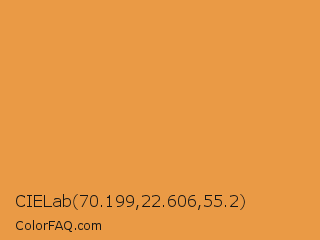 CIELab 70.199,22.606,55.2 Color is a normal orange color and the nearest color is Tigers Eye #e08d3c. Hex code #ea9a45 and RGB value is rgb(234,154,69). In RGB color space, this color is composed of 92% red, 60% green, 27% blue, In CMYK color space, this color is composed of 0% cyan, 34% magenta, 71% yellow , 8% black , In HSL color space, this color has a hue angle of 31° , 80% saturation and 59% lightness.