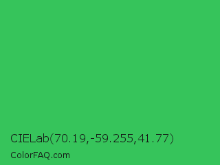 CIELab 70.19,-59.255,41.77 Color is a normal green color and the nearest color is UFO Green #3cd070. Hex code #36c45b and RGB value is rgb(54,196,91). In RGB color space, this color is composed of 21% red, 77% green, 36% blue, In CMYK color space, this color is composed of 72% cyan, 0% magenta, 54% yellow , 23% black , In HSL color space, this color has a hue angle of 136° , 57% saturation and 49% lightness.