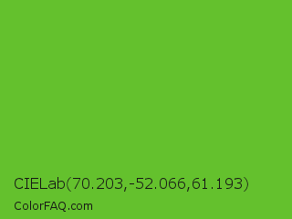 CIELab 70.203,-52.066,61.193 Color is a normal green color and the nearest color is Green RYB #66b032. Hex code #64c12d and RGB value is rgb(100,193,45). In RGB color space, this color is composed of 39% red, 76% green, 18% blue, In CMYK color space, this color is composed of 48% cyan, 0% magenta, 77% yellow , 24% black , In HSL color space, this color has a hue angle of 98° , 62% saturation and 47% lightness.