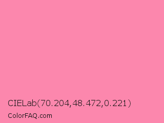 CIELab 70.204,48.472,0.221 Color is a light rose color and the nearest color is Tickle Me Pink #fc89ac. Hex code #fc87ad and RGB value is rgb(252,135,173). In RGB color space, this color is composed of 99% red, 53% green, 68% blue, In CMYK color space, this color is composed of 0% cyan, 46% magenta, 31% yellow , 1% black , In HSL color space, this color has a hue angle of 341° , 95% saturation and 76% lightness.