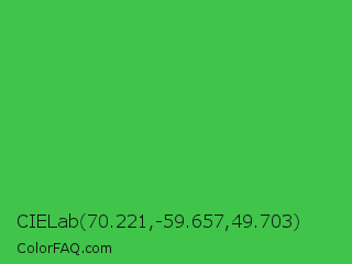 CIELab 70.221,-59.657,49.703 Color is a normal green color and the nearest color is Lime Green #32cd32. Hex code #40c44a and RGB value is rgb(64,196,74). In RGB color space, this color is composed of 25% red, 77% green, 29% blue, In CMYK color space, this color is composed of 67% cyan, 0% magenta, 62% yellow , 23% black , In HSL color space, this color has a hue angle of 125° , 53% saturation and 51% lightness.