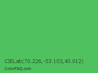 CIELab 70.226,-53.103,40.012 Color is a normal green color and the nearest color is Emerald #50c878. Hex code #4fc25f and RGB value is rgb(79,194,95). In RGB color space, this color is composed of 31% red, 76% green, 37% blue, In CMYK color space, this color is composed of 59% cyan, 0% magenta, 51% yellow , 24% black , In HSL color space, this color has a hue angle of 128° , 49% saturation and 54% lightness.