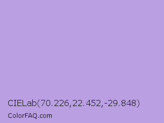 CIELab 70.226,22.452,-29.848 Color is a light violet color and the nearest color is Biloba Flower #b2a1ea. Hex code #baa0e2 and RGB value is rgb(186,160,226). In RGB color space, this color is composed of 73% red, 63% green, 89% blue, In CMYK color space, this color is composed of 18% cyan, 29% magenta, 0% yellow , 11% black , In HSL color space, this color has a hue angle of 264° , 53% saturation and 76% lightness.