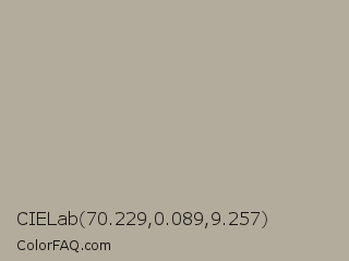 CIELab 70.229,0.089,9.257 Color is a light orange color and the nearest color is Taupe Gray #b3af95. Hex code #b3ab9b and RGB value is rgb(179,171,155). In RGB color space, this color is composed of 70% red, 67% green, 61% blue, In CMYK color space, this color is composed of 0% cyan, 4% magenta, 13% yellow , 30% black , In HSL color space, this color has a hue angle of 40° , 14% saturation and 65% lightness.