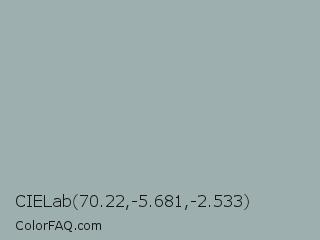 CIELab 70.22,-5.681,-2.533 Color is a light cyan color and the nearest color is Hit Gray #a1adb5. Hex code #9eafb0 and RGB value is rgb(158,175,176). In RGB color space, this color is composed of 62% red, 69% green, 69% blue, In CMYK color space, this color is composed of 10% cyan, 1% magenta, 0% yellow , 31% black , In HSL color space, this color has a hue angle of 183° , 10% saturation and 65% lightness.