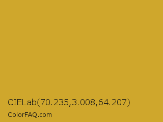 CIELab 70.235,3.008,64.207 Color is a normal orange color and the nearest color is Hokey Pokey #c8a528. Hex code #cfa72c and RGB value is rgb(207,167,44). In RGB color space, this color is composed of 81% red, 65% green, 17% blue, In CMYK color space, this color is composed of 0% cyan, 19% magenta, 79% yellow , 19% black , In HSL color space, this color has a hue angle of 45° , 65% saturation and 49% lightness.