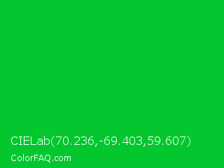 CIELab 70.236,-69.403,59.607 Color is a normal green color and the nearest color is Vivid Malachite #00cc33. Hex code #04c730 and RGB value is rgb(4,199,48). In RGB color space, this color is composed of 2% red, 78% green, 19% blue, In CMYK color space, this color is composed of 98% cyan, 0% magenta, 76% yellow , 22% black , In HSL color space, this color has a hue angle of 134° , 96% saturation and 40% lightness.
