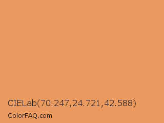 CIELab 70.247,24.721,42.588 Color is a light orange color and the nearest color is Big Foot Feet #e88e5a. Hex code #ea995f and RGB value is rgb(234,153,95). In RGB color space, this color is composed of 92% red, 60% green, 37% blue, In CMYK color space, this color is composed of 0% cyan, 35% magenta, 59% yellow , 8% black , In HSL color space, this color has a hue angle of 25° , 77% saturation and 65% lightness.