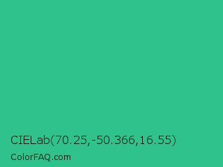 CIELab 70.25,-50.366,16.55 Color is a normal green color and the nearest color is Mountain Meadow #30ba8f. Hex code #30c28c and RGB value is rgb(48,194,140). In RGB color space, this color is composed of 19% red, 76% green, 55% blue, In CMYK color space, this color is composed of 75% cyan, 0% magenta, 28% yellow , 24% black , In HSL color space, this color has a hue angle of 158° , 60% saturation and 47% lightness.