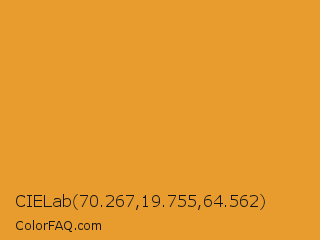CIELab 70.267,19.755,64.562 Color is a normal orange color and the nearest color is Fire Bush #e89928. Hex code #e89c2e and RGB value is rgb(232,156,46). In RGB color space, this color is composed of 91% red, 61% green, 18% blue, In CMYK color space, this color is composed of 0% cyan, 33% magenta, 80% yellow , 9% black , In HSL color space, this color has a hue angle of 35° , 80% saturation and 55% lightness.