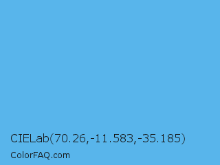 CIELab 70.26,-11.583,-35.185 Color is a light blue color and the nearest color is Blue Jeans #5dadec. Hex code #58b5eb and RGB value is rgb(88,181,235). In RGB color space, this color is composed of 35% red, 71% green, 92% blue, In CMYK color space, this color is composed of 63% cyan, 23% magenta, 0% yellow , 8% black , In HSL color space, this color has a hue angle of 202° , 79% saturation and 63% lightness.
