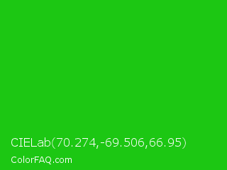 CIELab 70.274,-69.506,66.95 Color is a normal green color and the nearest color is Lime Green #32cd32. Hex code #1cc713 and RGB value is rgb(28,199,19). In RGB color space, this color is composed of 11% red, 78% green, 7% blue, In CMYK color space, this color is composed of 86% cyan, 0% magenta, 90% yellow , 22% black , In HSL color space, this color has a hue angle of 117° , 83% saturation and 43% lightness.