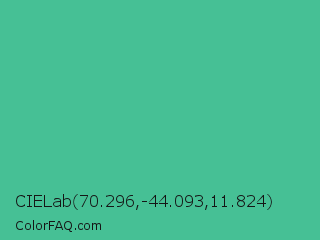 CIELab 70.296,-44.093,11.824 Color is a normal green color and the nearest color is Ocean Green #48bf91. Hex code #46c095 and RGB value is rgb(70,192,149). In RGB color space, this color is composed of 27% red, 75% green, 58% blue, In CMYK color space, this color is composed of 64% cyan, 0% magenta, 22% yellow , 25% black , In HSL color space, this color has a hue angle of 159° , 49% saturation and 51% lightness.