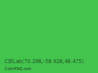 CIELab 70.298,-58.928,48.475 Color is a normal green color and the nearest color is Lime Green #32cd32. Hex code #42c44d and RGB value is rgb(66,196,77). In RGB color space, this color is composed of 26% red, 77% green, 30% blue, In CMYK color space, this color is composed of 66% cyan, 0% magenta, 61% yellow , 23% black , In HSL color space, this color has a hue angle of 125° , 52% saturation and 51% lightness.
