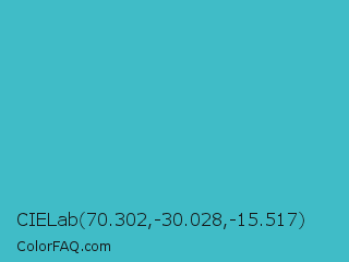 CIELab 70.302,-30.028,-15.517 Color is a normal cyan color and the nearest color is Sea Serpent #4bc7cf. Hex code #40bcc7 and RGB value is rgb(64,188,199). In RGB color space, this color is composed of 25% red, 74% green, 78% blue, In CMYK color space, this color is composed of 68% cyan, 6% magenta, 0% yellow , 22% black , In HSL color space, this color has a hue angle of 185° , 55% saturation and 52% lightness.