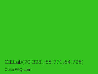 CIELab 70.328,-65.771,64.726 Color is a normal green color and the nearest color is Harlequin Green #46cb18. Hex code #34c61f and RGB value is rgb(52,198,31). In RGB color space, this color is composed of 20% red, 78% green, 12% blue, In CMYK color space, this color is composed of 74% cyan, 0% magenta, 84% yellow , 22% black , In HSL color space, this color has a hue angle of 112° , 73% saturation and 45% lightness.