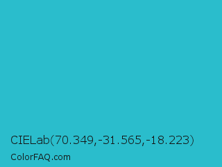 CIELab 70.349,-31.565,-18.223 Color is a normal cyan color and the nearest color is Scooter #2ebfd4. Hex code #2abdcc and RGB value is rgb(42,189,204). In RGB color space, this color is composed of 16% red, 74% green, 80% blue, In CMYK color space, this color is composed of 79% cyan, 7% magenta, 0% yellow , 20% black , In HSL color space, this color has a hue angle of 186° , 66% saturation and 48% lightness.