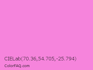 CIELab 70.36,54.705,-25.794 Color is a light magenta color and the nearest color is Pale Magenta #f984e5. Hex code #f684dc and RGB value is rgb(246,132,220). In RGB color space, this color is composed of 96% red, 52% green, 86% blue, In CMYK color space, this color is composed of 0% cyan, 46% magenta, 11% yellow , 4% black , In HSL color space, this color has a hue angle of 314° , 86% saturation and 74% lightness.