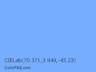 CIELab 70.371,3.949,-45.23 Color is a light blue color and the nearest color is French Sky Blue #77b5fe. Hex code #76aefe and RGB value is rgb(118,174,254). In RGB color space, this color is composed of 46% red, 68% green, 100% blue, In CMYK color space, this color is composed of 54% cyan, 31% magenta, 0% yellow , 0% black , In HSL color space, this color has a hue angle of 215° , 99% saturation and 73% lightness.