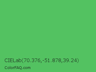 CIELab 70.376,-51.878,39.24 Color is a normal green color and the nearest color is Fern #63b76c. Hex code #53c261 and RGB value is rgb(83,194,97). In RGB color space, this color is composed of 33% red, 76% green, 38% blue, In CMYK color space, this color is composed of 57% cyan, 0% magenta, 50% yellow , 24% black , In HSL color space, this color has a hue angle of 128° , 48% saturation and 54% lightness.