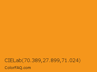 CIELab 70.389,27.899,71.024 Color is a normal orange color and the nearest color is Tree Poppy #fc9c1d. Hex code #f5961b and RGB value is rgb(245,150,27). In RGB color space, this color is composed of 96% red, 59% green, 11% blue, In CMYK color space, this color is composed of 0% cyan, 39% magenta, 89% yellow , 4% black , In HSL color space, this color has a hue angle of 34° , 92% saturation and 53% lightness.