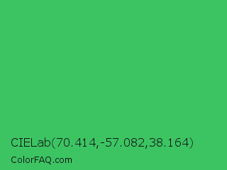 CIELab 70.414,-57.082,38.164 Color is a normal green color and the nearest color is UFO Green #3cd070. Hex code #3cc463 and RGB value is rgb(60,196,99). In RGB color space, this color is composed of 24% red, 77% green, 39% blue, In CMYK color space, this color is composed of 69% cyan, 0% magenta, 49% yellow , 23% black , In HSL color space, this color has a hue angle of 137° , 54% saturation and 50% lightness.